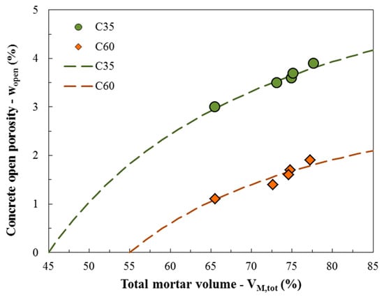 Meanwhile, from the percentage of total mortar volume of each mixture (as explained above, the sum of the mortar present in the RCAs with the new mortar of the mixture), the following relationship is shown in Figure 3: the higher the total mortar volume (VM,tot), the higher the open porosity of concrete (wopen) (i.e., absorption). This is explained by the fact that the open porosity of concrete also depends on the raw materials employed within the mixture, and, in the specific case of RACs, it is influenced by the presence of the porous attached mortar inside or around the RCAs particles. Thus, the strong connection between these two parameters, that is, the trend of the increasing curves in Figure 3, can be described by the following proposed equation, where k1, k2, and VM,0 represent numerical parameters calibrated for both normal and high strength classes: