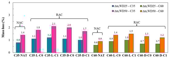 The mass loss results for natural aggregate concrete (NAC) and RAC after 25 and 50 wet-dry cycles are shown in Figure 4. The normal strength class presented larger mass losses than the high-performance class for both 25 and 50 cycles. This fact is associated with the higher porosity of C35, which allows a greater flow of water through its internal structure in the wetting stage, together with a lower resistance of its mortar to the shrinkage that occurs in the drying stage, causing micro cracking in concrete. This behavior is in agreement with that explained by Wu et al. [].