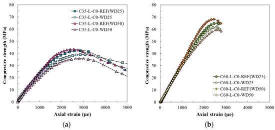 Typical compressive behavior of reference and after wet-dry degradation. (a) C35; (b) C60.