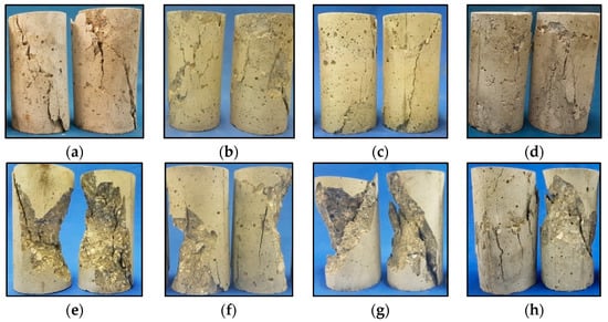 Typical rupture of C35 and C60 in the compressive strength test in the wet-dry durability study. (a) C35-REF(WD25); (b) C35-WD25; (c) C35-REF(WD50); (d) C35-WD50; (e) C60-REF(WD25); (f) C60-WD25; (g) C60-REF(WD50); (h) C60-WD50.
