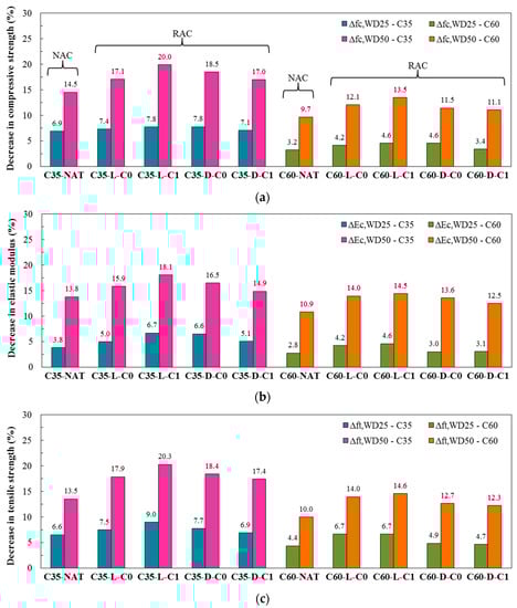 For the normal strength class, tensile strength values showed a decrease of 6.6% to 9.0% for samples degraded by 25 cycles, and a decrease of 17.4% to 20.3% for RACs, and 13.5% for natural concrete after 50 cycles (Figure 7c). Therefore, C35-NAT was the one that showed an evident better behavior when subjected to a higher number of degradation cycles. The drop rates of tensile strength for the two cycle phases (0–25 and 25–50) were very similar, with no significant increase in the second phase, different from what happened to compressive strength and elastic modulus. C60 showed lower percentage losses than C35 after cycles. For C60, the tensile strength percentage loss was between 4.4% and 6.7% for 25 cycles and it increased to 10% to 14.6% after 50 cycles. At the end of 50 cycles, C60-L-C1 had the highest percentage impact on this property and C60-NAT had the lowest.