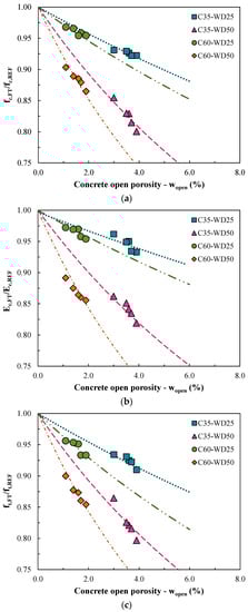With the experimental results obtained for the properties discussed above, a generalized degradation law is proposed for RAC subjected to wet-dry cycles. The law represents the relationships between an initial property of the intact concrete, in this case, the concrete open porosity (wopen), and the variations obtained in the main mechanical properties of concrete after wet-dry degradation, that is, compressive strength (fc), elasticity modulus (Ec), and tensile strength (ft). The three proposed relationships are described in the following equations: