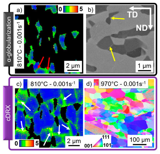The intricate α-lamellar structure in the Ti-17 leads to the rotation, kinking or bending of the lamellas during plastic deformation. Dislocations are formed and rearranged into LAGBs as indicated in the KAM map in Figure 4a by the red arrows. If boundaries are formed within the α-phase, migration of the α/β interface occurs, leading to the formation of globular α-grains, as shown in Figure 4b (yellow arrows).