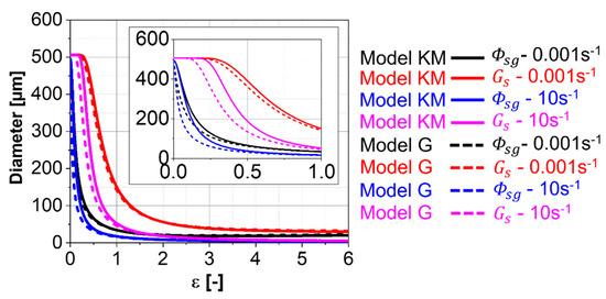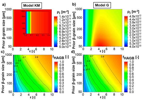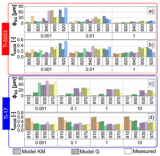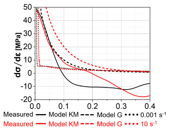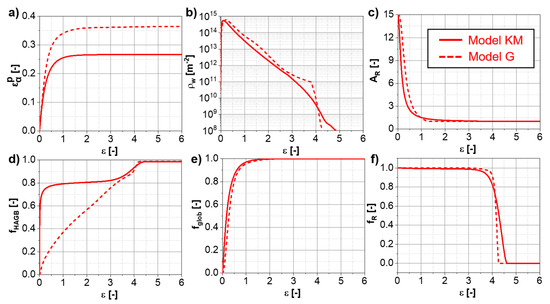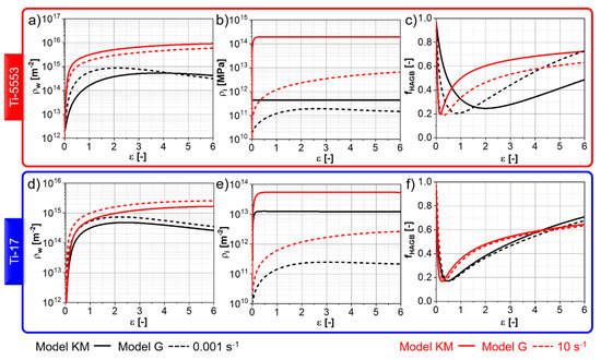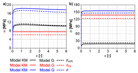 The overall differences in the flow stress evolution between the “Model KM” and the “Model G” are minor. Figure 6a,b shows the evolution of the stress components predicted for the Ti-17 deformed at 970 °C, and 0.001 s−1 and 10 s−1, respectively, up to large strains. A slight softening is observed at 0.001 s−1 and corresponds to the decrement of the factor of strengthening (, see Appendix C) due to the progressive increase in the average boundary misorientation angle. The differences between “Model KM” and “Model G” for the thermal stress are related to the different initial dislocation densities assumed as initial values for each model. However, if both models are initialized with the same dislocation densities, there is no difference in thermal stress between “Model KM” and “Model G”. “Model G” exhibits a faster increase in the athermal stress at the beginning of deformation compared to “Model KM”.