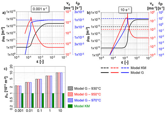 The mobile dislocation density is considered to be constant at a constant strain rate, in agreement with the Orowan’s relationship (Equation (13)). The experimental strain rate () and the plastic strain rate () are the same.