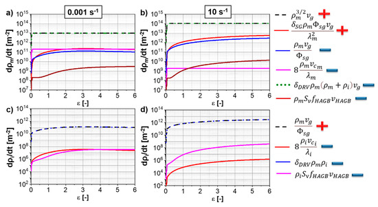 Equation (14) describes the rate for mobile dislocation density. The terms were initially proposed by [18]. The terms related to the production of dislocations at subgrain boundaries and the movement of HAGBs during cDRX are further incorporated into the model as described in Ref. [19].