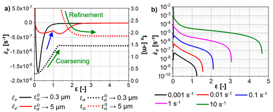 The evolution of the boundary dislocations density is related to the evolution of the subgrain size; Equation (9). The grain size () and the subgrain size () of the β-phase are calculated according to Equations (23) and (24), respectively.