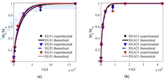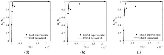 Experimental and theoretical values of one-way release tests of cinnamon essential oils (CEOs) released from films EG1–EG4 (a–d), EGA1–EGA4 (e–h), and EGC1–EGC4 (i–l) to absolute ethanol at 4 °C.