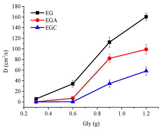 In addition, in the range of 0.3–0.6 mL, the increment of DEGA and DEGC per unit glycerol is significantly smaller than that of DEG. This may be due to the stronger electrostatic interaction between the chains in films EGA and EGC, which squeezes more glycerol into the holes originally existing between chains. Moreover, there are more hydroxyl groups in acacia gum and sodium carboxymethyl cellulose molecular chains than in gelatin chains. Since the hydroxyl groups have stronger adsorption on glycerol, glycerol might distribute more finely and stably in the holes between chains, thus reducing the influence on diffusion.