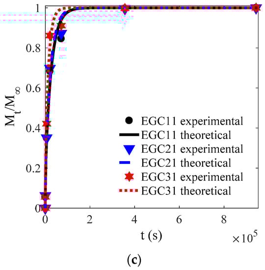 Experimental and theoretical values of one-way release tests of CEOs released from films EG (a), EGA (b), EGC (c) to water at 4 °C.