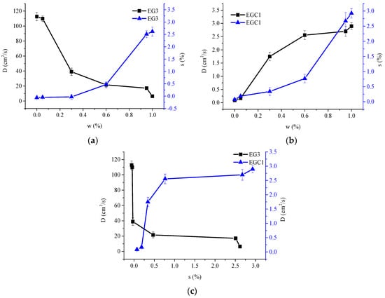 Table 6 shows that for those D values of CEOs diffused to ethanol that are much greater or less (two orders of magnitude, for instance) than those which diffuse to water, the diffusion of CEOs in the film is very sensitive to water. As shown in Figure 7a, D can be greatly changed by a low moisture content and small swelling rate. For instance, for film EG3, D decreases dramatically in the range of a low percentage of moisture in the solvent (w = 0 to 0.3) and film (s = −0.06 to −0.03). This might be due to the long spacing between polymer chains, which has already made the film reach the range of weak and slow change of a molecular force field (as discussed in Section 3.3). Thus, the promoting effect by swelling and ethanol extraction is not significant. On the contrary, with the increase of percentage of moisture in the solvent, the partition coefficient decreased greatly, and the blocking effect of water plays a leading role, hence greatly reducing the D of CEOs.