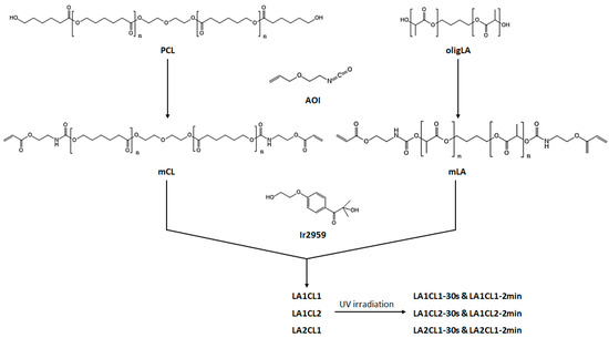 Crosslinking were performed using a percentage of 4% of the carbon double bonds moles with a well-known biocompatible photoinitiator (Ir2959). Different irradiation times were tested and after 30 s crosslinked networks were obtained. However, a second irradiation time of 2 min was also tested in order to determine potential differences in the materials properties. It was found that the films with the highest amount of mLA were more flexible, while those that contained the highest amount of mCL became more resistant. A typical reaction scheme is presented in Figure 1.