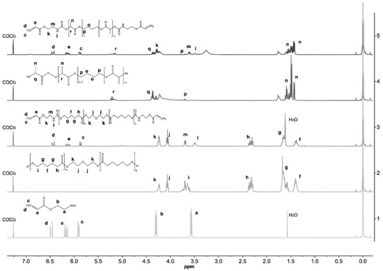 1H NMR spectra of (1) 2-isocyanoethyl acrylate (AOI) (2) polycaprolactone (PCL) (3) mPA (4) oligomers based on lactic acid (oligLA) (5) mLA in deuterated chloroform (CDCl3) at 400 MHz.