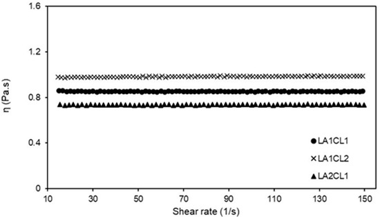 The similarity in flow behavior between the materials indicates that there are slight changes in their molecular structures. Additionally, all blends have relatively low viscosities, with values between 0.7 and 1 Pa.s, with LA2CL1 being the one with the lowest shear viscosity value. The results herein obtained are in agreement with the values previously reported in literature, including the tests performed on commercial bioadhesives [20,21].