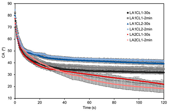 Figure 4 shows the registered dynamic water contact angle results for the different blends after 30 s or 2 min of crosslinking reaction time. The results revealed that all WCA started between 75° and 85°, showing a slightly hydrophobic behavior of all blends. Furthermore, the crosslinking time did not influence the water affinity of the blends, since no significant differences in the water spreading could be registered between the different crosslinking reaction times. However, some differences can be noticed concerning the composition of the blends. The evidence of mCL and mLA amount in the blends composition can be perceived from the obtained results. The adhesives with higher amount of mCL showed to have a less hydrophilic surface, with a final WCA of around 43°, due to PCL’s strong hydrophobic nature [20]. On the other hand, the adhesives with higher amount of mLA (LA2CL1) presented lower WCA (around 20°) due to the presence of the hydrophilic OH groups from LA [2], with the tendency to decrease, while the adhesives LA1CL1 and LA1CL2 presented a stable WCA of around 40° and 35°, respectively, after 35 s. Therefore, the presence of a higher amount of mLA influences the biological response of these materials.