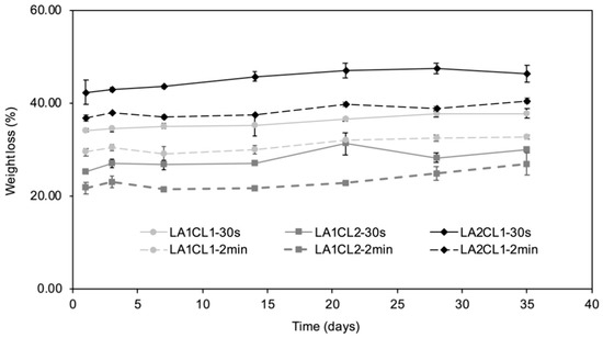 The hydrophobicity and stability of PCL makes the mCL macromer more resistant and stable than mLA macromer, whose ester bonds are more susceptible to hydrolytic degradation [21,22]. These results are also related to the WCA (Section 3.4), which showed that adhesives with a higher amount of mLA presented lower WCA and, consequently, a more hydrophilic surface. As can be observed in Figure 5, the increase in the proportion of mLA in the adhesives resulted in higher weight loss percentages. LA2CL1 adhesive presented the higher degradation value: 46.39% ± 1.75% for 30 s irradiation. On the contrary, LA1CL2-2min presented the lowest weight loss degree (26.82% ± 2.40%). All tested adhesives showed higher percentages of degradation for shorter irradiation times, due to lower degree of crosslinking.