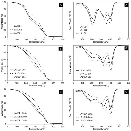 Thermograms registered for the blended macromers (A) and their crosslinking products obtained with 30 s (B) and 2 min (C) of UV irradiation. Figures A’, B’ and C’ show the correspondent derivative thermogravimetry (DTG) thermograms.