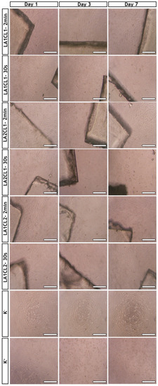 Optical microscopic images of NHDF cells cultured in the presence of produced films (LA1CL1, LA1CL2 and LA2CL1 photocrosslinked for 2 min and 30 s) for 1, 3 and 7 days; K− (negative control); K+ (positive control). Scale bar represents 200 µm. Magnification 100×; resolution 1.2 µm.