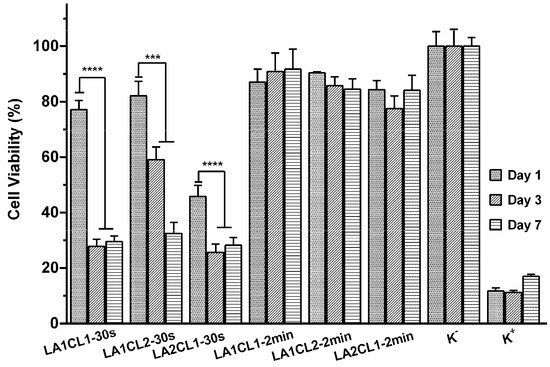 Characterization of cell viability through the MTT assay after 1, 3 and 7 days of incubation. K− (negative control); K+ (positive control). Data are presented as the mean ± standard deviation, n = 5, *** p < 0.001, **** p < 0.0001.