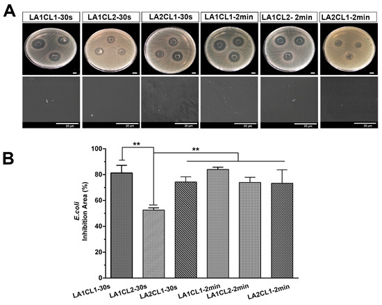 The results presented in Figure 9 clearly evidenced that all formulations displayed a high antimicrobial effect against E. coli growth, exhibiting an inhibition area higher than 70%, with the exception of the LA1CL2-30s formulation that displayed a lower inhibition area with a value of 52.63% ± 1.68%.