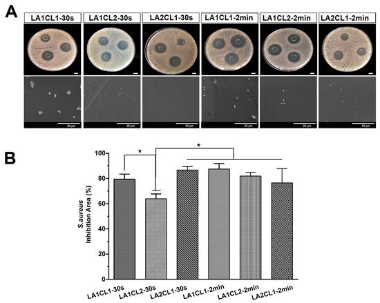 Similar results were also observed when the adhesives were incubated with S. aureus (Figure 10), where higher inhibition area values (>75%) were noticed for all adhesives, with lower inhibition area value (63.95% ± 3.77%) exhibited by LA1CL2-30s formulation. Such results were expected since this formulation presents a higher amount of mCL and PCL is known by its hydrophobicity and non-antimicrobial activity [27,28].