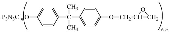 An epoxyphosphazene resin, which is a homogeneous mixture of a conventional bisphenol-A-based epoxy oligomer and epoxyphosphazene oligomer (EP) of the following general formula (Figure 1), was obtained in Mendele ev University of Chemical Technology (Russia) according to the technique [22] in such a way that EP content in epoxyphosphazene resin was 50% by weight. Epoxy group content in epoxyphosphazene resin was 17-19%, chlorine content was 2.5%.