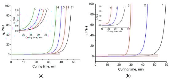 Dependencies of viscosity η on curing time: (a) at 170 °С for formulations 1–4, (b) at 160 °C (1), 170 °C (2), 180 °C (3) for formulation 2.
