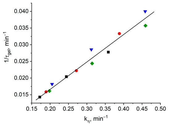 Dependence of the inverse gel time (τgel−1) on the viscosity increase rate constant (kη) for formulation 1 (square), 2 (circle), 3 (triangle), 4 (rhomb).