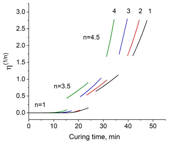 If we accept the above statements, then we can actually notice a correlation between Equations (6) and (7). Obviously, this theoretical assumption can be easily verified by plotting dependencies in the coordinates η1/n (t) with a subsequent approximation with straight lines in the areas corresponding to the values of n (Figure 4).