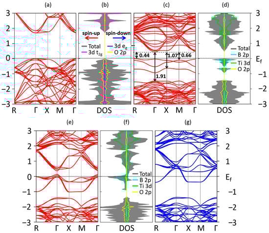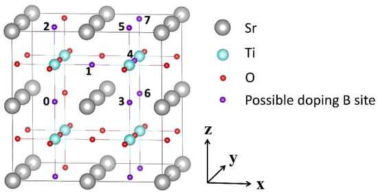 - Maldonado, F.; Maza, L.; Stashans, A. Electronic properties of Cr-, B-doped and codoped SrTiO3. J. Phys. Chem. Solids 2017, 100, 1–8. [Google Scholar] [CrossRef]