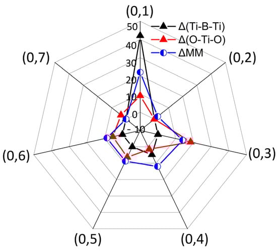 | (0,j) | ∆(Rd) | ∆(B-Ti) | ∆a | ∆b | ∆c | ∠Ti-B-Ti | ∠O-Ti-O | Charge | |