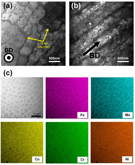 - Kim, Y.-K.; Choe, J.; Lee, K. Selective laser melted equiatomic CoCrFeMnNi high-entropy alloy: Microstructure, anisotropic mechanical response, and multiple strengthening mechanism. J. Alloys Compd. 2019, 805, 680–691. [Google Scholar] [CrossRef]
