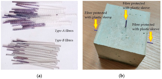 Specimens for pull-out test: (a) Type-A and Type-B fibres highlighting the embedment length; (b) a typical cube with embedded fibres.