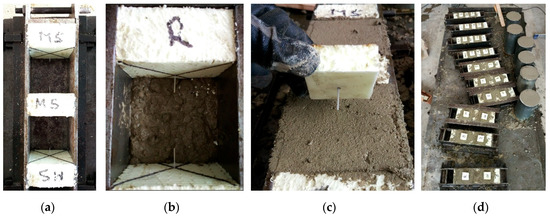 Preparing pull-out test specimens: (a) steel moulds with expanded polystyrene; (b) mould partially filled with concrete; (c) a manual placement of the top fibre; (d) specimen series after concreting.