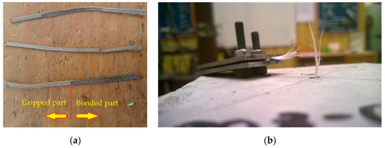 The former attempts to investigate the bond performance of synthetic macro-fibres [37] demonstrated the necessity of a reliable protection system for the polymeric fibre samples. Either loss of the cohesive contact with grips or slip of the protection sleeves would defeat the pull-out test and thus should be avoided. Figure 3 shows the typical examples of the preliminary tests. These unsuccessful results motivated the development of a gripping system to protect the fibres from local damage. In the same manner as applied previously [37], plastic sleeves (Figure 3a) were used for preserving the unbonded part of the fibres from damage. The mechanical properties (flexibility and friction coefficient) of the sleeves were chosen using the trial-and-error procedure. Adjustable steel clamps (Figure 4a) were additionally introduced to fix the protected fibre, preventing the localisation of stresses induced by the gripping system of the tension apparatus (Figure 4b–d).