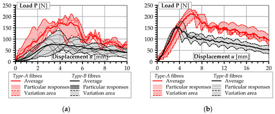 Load–displacement diagrams of the pull-out tests: (a) fibres with embedment length le = 10 mm; (b) le = 20 mm.