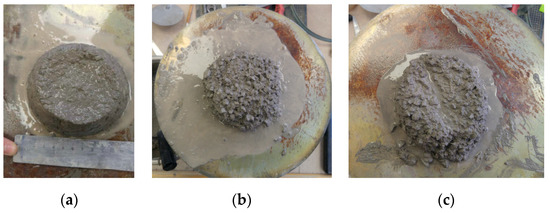 Slump tests during trial mixing: (a) 0.5% steel micro-fibre content with 2.2 kg/m3 superplasticiser; (b) segregation of paste in the concrete with 0.5% steel micro-fibres at an interim stage of trial mixing; (c) Mix 3b (Table 3).