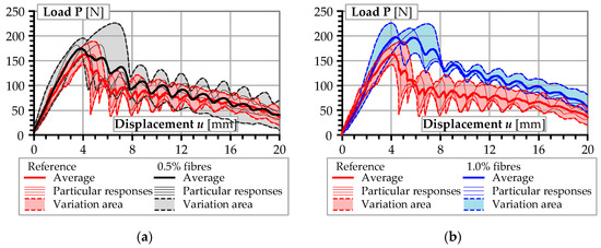 Comparison of the pull-out test results of reference concrete (red lines) and concrete containing steel micro-fibres (black lines): (a) with fibre content of 0.5%; (b) with fibre content of 1.0%.
