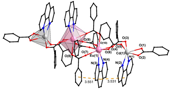 - Shmelev, M.A.; Gogoleva, N.V.; Kuznetsova, G.N.; Kiskin, M.A.; Voronina, Y.K.; Yakushev, I.A.; Ivanova, T.M.; Nelyubina, Y.V.; Sidorov, A.A.; Eremenko, I.L. Cd(II) and Cd(II)–Eu(III) Complexes with Pentafluorobenzoic Acid Anions and N-Donor Ligands: Synthesis and Structures. Russ. J. Coord. Chem. 2020, 46, 557–572. [Google Scholar] [CrossRef]