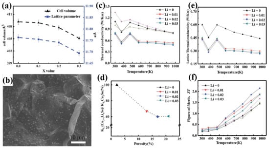 (a) Lattice parameters and cell volume of Cu2−xLixSe (x = 0.1–0.3), a monotonous decrease can be observed when increase x; (b) SEM image of Cu1.97Li0.03Se; (c) Thermal conductivity of Cu2-xLixSe with temperatures range from 300 K to 1000 K; (d) The relationship between lattice thermal conductivity and porosity; (e) Lattice thermal conductivity of Cu2−xLixSe with temperatures range from 300 K to 1000 K; (f) Figure of merit (ZT) of Cu2-xLixSe with temperatures range from 300 K to 1000 K [41].