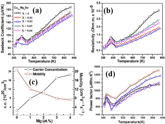 TE properties of Cu2−xMgxSe (a) Temperature dependence of Seebeck coefficient; (b) Temperature dependence of resistivity ( is electrical conductivity); (c) Mg atom concentration dependence of carrier (hole) concentration and carrier mobility; (d) Temperature dependence of thermal conductivity [48].