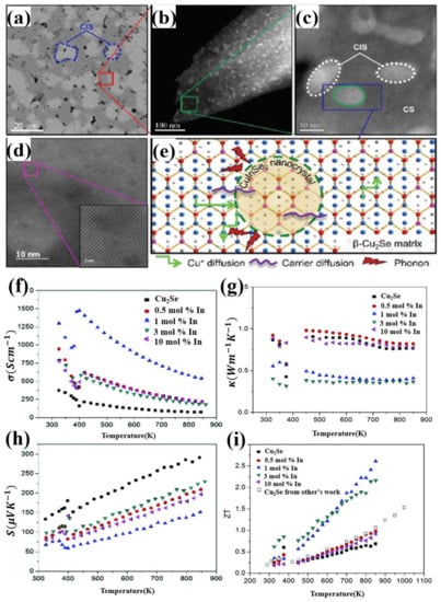 (a) Back scattered electron (BSE) image of the sample composed of 50% Cu2Se(CS) and 50% CuInSe2 (CIS), showing an interweaving structure of CIS and CS on a microscale; (b) HAADF-STEM image of the CS region enclosed in red in (a), showing a interweaving structure of CIS and CS on a nanoscale; particle sizes are under 10 nm; (c) higher magnification image of the region marked in green in (b), two distinct phase of CS and CIS can be observed; (d) STEM image of the sample with 1 mol% In, the inset shows a well-ordered atomic structure; (e) Schematics showing the lattice of CS and CIS composite and their interfaces, mechanism of phonon scattering, carrier diffusion as well as the Cu+ diffusion; (f) Temperature dependence of electrical conductivity; (g) Temperature dependence of thermal conductivity; (h) Temperature dependence of Seebeck coefficient; (i) Temperature dependence of figure of merit (ZT) [51].