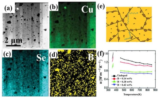 Other elements in group IIIA are also used as dopants in Cu2Se, though with inferior ZT value to ones discussed above, interesting mechanisms that enhance the TE properties are quite worthy of mentioning. Cu2Se with nano-boron incorporated is carried out by Sheik Md. Kazi Nazrul Islam et al. [52], through ball-milling and SPS. Nano-boron particles are precipitated at the grain boundaries, as is shown in schematics, HAADF STEM image and EDS map in Figure 6a–e. Those insolating precipitants works as perfect phonon scattering centers, as a result, the thermal conductivity of the Cu2Se is significantly decreased, shown in Figure 6f. Even though the final highest ZT value of this sample only reached 1.6 at 852 K, much lower in comparison to Al and In doping, the ZT enhancement ratio is relatively high which is by a factor of 1.6 to 2.6 compared to the undoped sample. Thus, B is still a promising dopant for ZT enhancement of Cu2Se, if other synthesizing methods like hydrothermal methods and hot pressing are exploited to increase the ZT value of the original undoped sample, it is likely that the B doped samples can achieve better results. Ga doping is also investigated by F.S Liu et al., through ball milling and SPS [53]. A second phase CuGaSe2 is formed in the matrix, but Liu found this second phase have an opposite effect which is increasing the thermal conductivity while decreasing the electronic conductivity, and the increment of ZT value of their samples is not distinct, even it is decreased at some certain content.