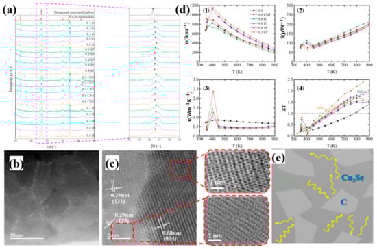 Comprehensive investigations on Cu2Se have been conducted by Lanlin Zhao et al. doped by a variety of carbon resources, including graphite (G), carbon nanotubes (CNT), super P (SP) and hard carbon (H) [54]. Among these, 0.3 wt% carbon fiber doped Cu2Se achieved the highest ZT value of 2.4 at 850 K. The composites are synthesized through solid state reaction and melt quenching. It is interesting to note that, from Figure 7a, the final composite synthesized by melt quenching, shows no dependence on the initial carbon sources, i.e., no matter what kind of carbon source is chosen, the eventual samples are composed of hexagonal carbon and monoclinic Cu2Se at room temperature. As is shown in Figure 7b,c, where the Cu2Se matrix are composed of small grains with sizes from 30–60 nm, and the carbon nanoparticles are gathered in grain boundaries. During the melt-quenching process, carbon precipitates played an important role in preventing grain ripening. As displayed in Figure 7d, Cu2Se with various carbon dopants shows an overall increase in the electrical conductivity and decrease in the thermal conductivity, leading to enhanced ZT values. The electrical conductivity increment can be apparently attributed to the high electrical conductivity nature of carbon. As for the thermal conductivity, which is dominant in enhancing the ZT values, is due to the huge amount of grain boundaries with carbon decorates. Those carbon nanoparticles, as indicated in the schematics in Figure 7e, can scatter phonons, resulting in a significant increase in the thermal boundary resistance, namely decrease in thermal conductivity. This mechanism is quite similar to boron-doped samples discussed in the section above.