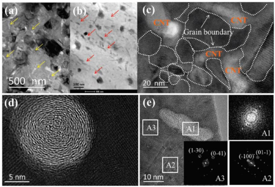 Structure characterization for samples with 0.75 wt% CNTs. (a) TEM image of CNTs doped samples with low magnification, yellow arrows are indicating carbon nanotubes with light contrast; (b) High angular annular dark field (HAADF) image, carbon nanotubes indicated by red arrows are in dark contrasts; (c) High magnification image, grain boundaries are denoted by white dashed lines; (d,e) observation of nanotubes along and normal to the tube directions respectively; insets A1, A2, A3 are Fast Fourier Transformation (FFT) patterns of regions marked in (c) [55].