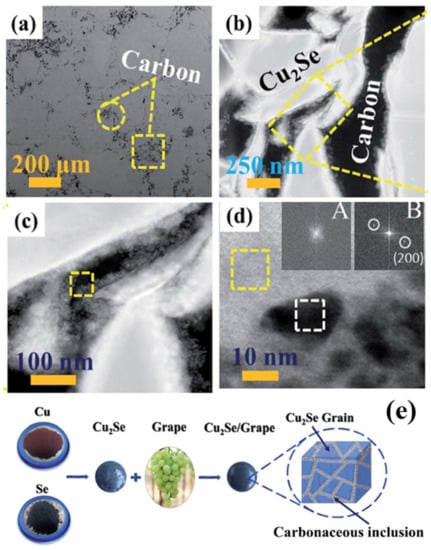 Apart from using expensive ingredients like carbon-nanotubes or graphene, novel approaches using grape juice as carbon resources are proposed by Sheik Md Kazi Nazrul Islam et al. [58], and an extraordinarily high ZT value of 2.5 at 984 K is obtained. In their synthesis process, Cu2Se powders are mixed with grape juice and dried up on a hot plate. Then the samples are calcined into bulks and heated up to 1200 °C. Finally, a polycrystalline Cu2Se structure, with C and Cu2O enriched boundaries is obtained, which is displayed in the STEM image in Figure 9a–d. Moreover, zooming in at the region of grain boundaries, Cu2O can be found at the interface between C and Cu2Se. Those Cu2O inclusions and carbon particles, together formed a carbonaceous material at grain boundaries, as illustrated in the schematics in Figure 9e. The TE performance of the samples are displayed in Figure 10. The existence of C and Cu2O, can increase the hole concentration and enhance electrical conductivity (seen in Figure 10a,b). In addition, the carbonaceous material can decrease the thermal conductivity by strengthen the phonon scattering at grain boundaries, which is illustrated in Figure 10d, the thermal conductivity measurement is displayed in Figure 10c. Thus, from Figure 10e, an overall enhancement of ZT value can be observed in all grape juice ‘doped’ samples, and a good thermal stability can be observed in Figure 10f.