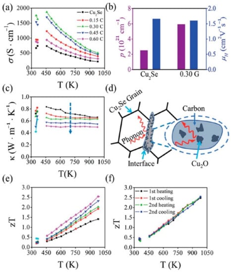 TE performance of all samples. (a) Temperature dependance of electrical conductivity ; (b) carrier concentration ( ) and carrier (hole) mobility ( ) of pure Cu2Se and 0.3 wt% doped Cu2Se (0.3 G); (c) Temperature dependence of thermal conductivity; (d) Schematics of phonon scattering by carbonaceous grain boundaries; (e) Temperature dependence of figure of merit (ZT); (f) Four repeated measurement of ZT value for 0.6 wt% C doped sample [58].