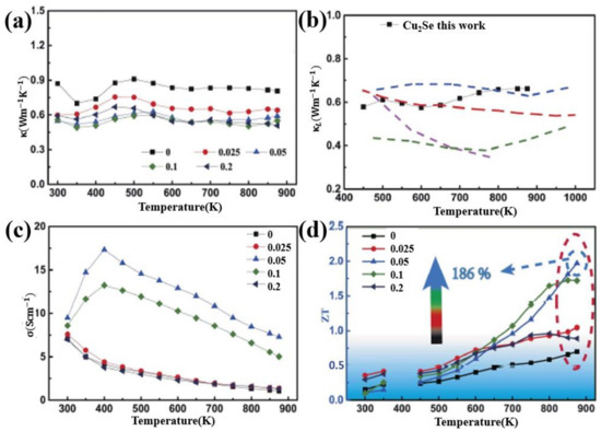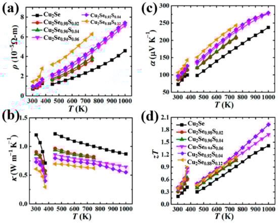 Temperature dependence of TE properties for Cu2Se1−xSx (x = 0.02–0.12). (a) resistivity: ; (b) thermal conductivity (c) Seebeck coefficient (the same with S in previous paragraphs); (d) Figure of merit (ZT) [63].