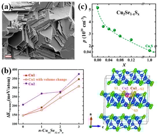 (a) SEM image of Cu2Se0.88S0.12, showing a stacked plates microstructure; (b) S concentration dependence of Cu vacancy formation energy (), Cu1, Cu2 are indicated in the lattice schematics on the right-hand side; (c) S concentration dependence of hole concentration ( ).