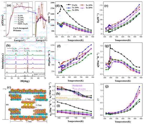 Widespread investigations are also conducted on Te-doped Cu2Se materials. Sajid Butt et al., carried out a Te-doping Cu2Se through ball-milling and SPS, a high ZT value of 1.9 at 873 K (mid-temperature range) is achieved with Te concentration of 10 mol% [67]. As shown in Figure 15a, the XANE spectra of Cu2Te and Te doped Cu2Se, distinctive A, B, and C peaks, which are the characteristics of Cu2Te can be observed in all Te doped samples, demonstrate the existence of a Cu2Te second phase, which is undetectable for XRD, as is shown in Figure 15b. This second phase (nanoclusters) can be described in the cartoon in Figure 15c, in a hexagonal pattern with Te replacing the original Se sites. By introducing Cu2Te nanoclusters, the carrier mobility is undercut by enhanced carrier scattering and carrier concentration is decreased. As a result, the electrical conductivity is hugely decreased and the Seebeck coefficient is increased, the overall effect is that the power factor almost remains unchanged, seen in Figure 15d–f. Thus, the improvement of the ZT value should be owing to the decreased thermal conductivity. Seen in Figure 15g–i, the decrease of thermal conductivity is also on the carrier’s part, as the lattice thermal conductivity is almost untouched and the carrier thermal conductivity is significantly decreased due to the decrease of electrical conductivity. With this ultralow thermal conductivity, the ZT value is conspicuously improved in mid-temperature range as displayed in Figure 15j.
